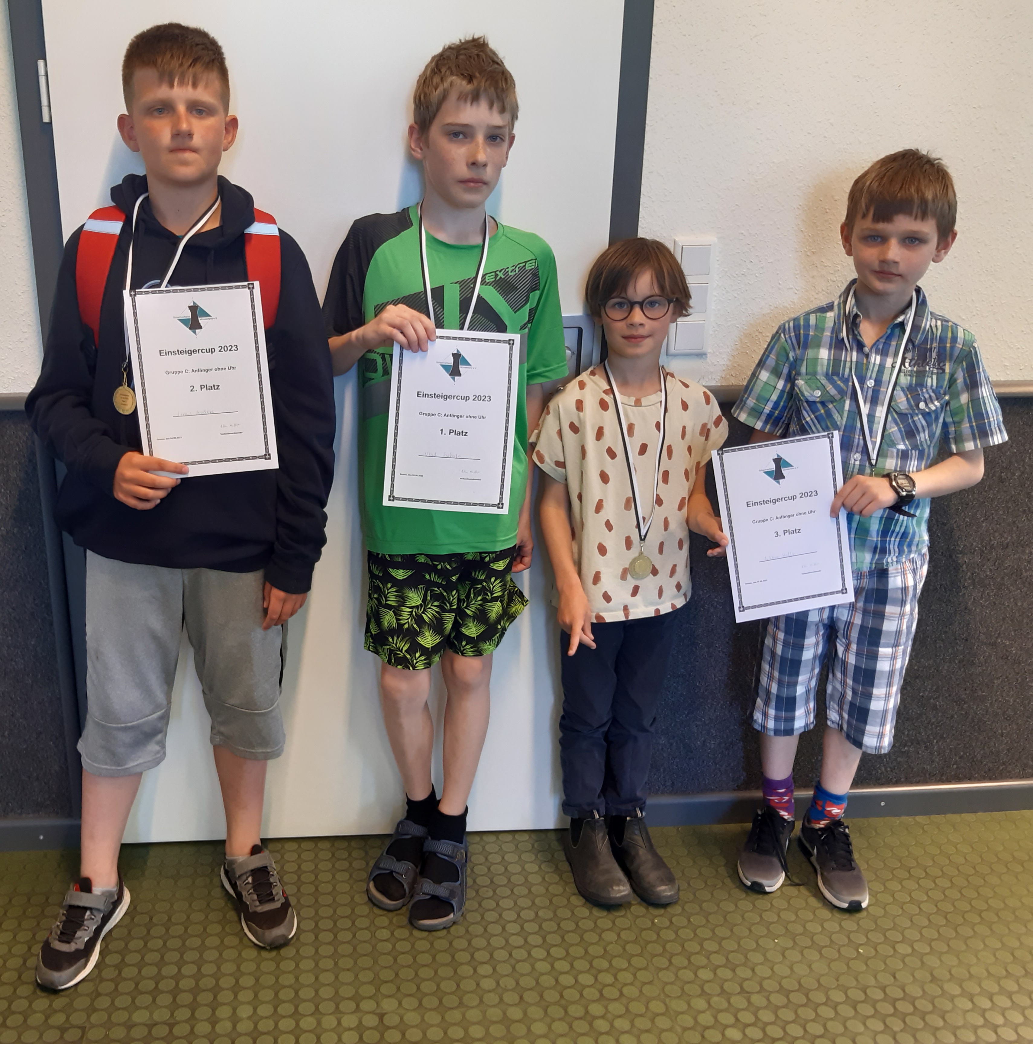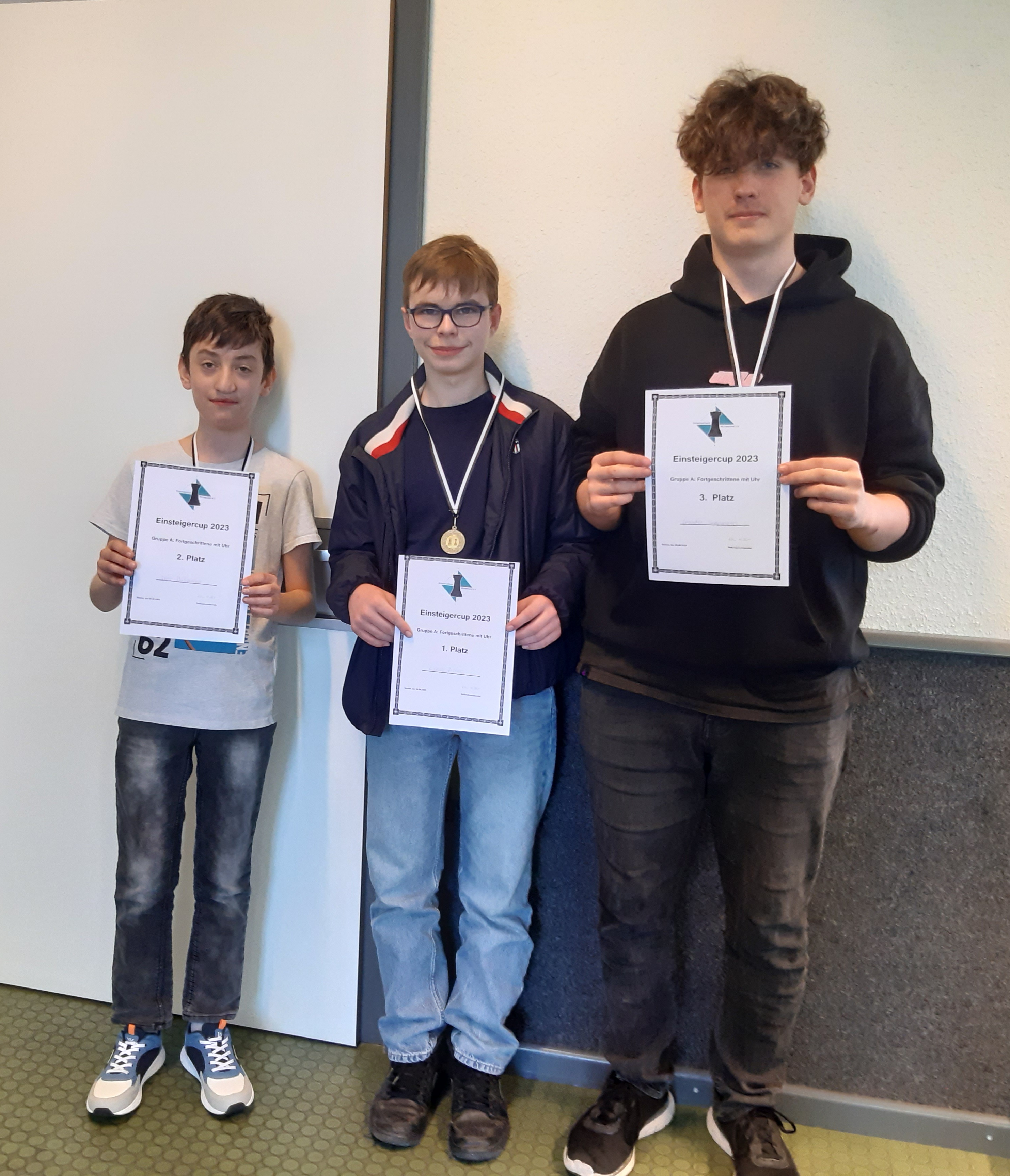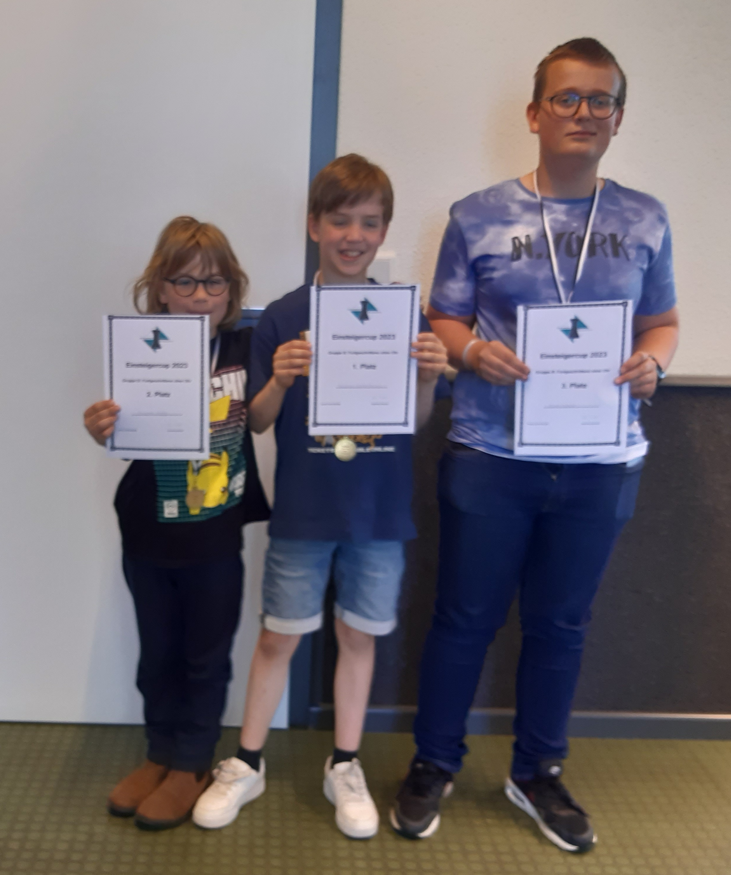 Einsteigercup in Gronau 33 Kinder und Jugendliche haben am Sonntag beim 3. Einsteigercup der Saison in Gronau teilgenommen. Hier die Tabellen der drei Gruppen sowie die Siegerfotos: A-Gruppe Rangliste: Stand nach der 5. Runde Rang Teilnehmer Titel TWZ At Verein/Ort S R V Punkte Buchh 1. Linus Zinke 796 Gronau 4 1 0 4.5 13.5 2. Theo Mußmann 723 Gronau 4 0 1 4.0 14.5 3. Leander Sumpmann Billerbeck 3 0 2 3.0 12.5 4. Jenny Rathmann 681 Steinfurt 2 2 1 3.0 10.0 5. Jonathan Meinert Rheine 2 1 2 2.5 11.0 6. Emilian Hauser Gronau 2 1 2 2.5 10.0 7. Moritz Thieben Rheine 2 0 3 2.0 14.5 8. David Seidel Emsdetten 2 0 3 2.0 14.0 9. Malte Wiegand 758 Steinfurt 1 1 3 1.5 12.5 10. Luan-Felix Meinecke Gronau 0 0 5 0.0 12.5 (v.l.n.r.: Theo Murmann, Linus Zinke, Leander Sumpmann) B-Gruppe Rangliste: Stand nach der 5. Runde Rang Teilnehmer Titel TWZ At Verein/Ort Land S R V Punkte Buchh SoBerg 1. Paulinus Heckenka Bocholt 5 0 0 5.0 13.0 13.00 2. Vincent Hoffs Bocholt 4 0 1 4.0 12.5 7.50 3. Nico Scholz Billerbeck 3 0 2 3.0 14.5 5.50 4. Luis Li Emsdetten 3 0 2 3.0 13.5 6.50 5. Jason Dubs Bocholt 3 0 2 3.0 12.0 4.50 6. Damian Robers Billerbeck 2 0 3 2.0 13.5 2.50 7. Tom Krunnies Heiden 2 0 3 2.0 12.0 1.50 8. Niklas Klag Heiden 2 0 3 2.0 11.0 1.00 9. Nevin Avsar Emsdetten 1 0 4 1.0 10.0 1.50 (v.l.n.r. Vincent Hoffs, Paulinus Heckenkamp, Nico Scholz) C-Gruppe Rangliste: Stand nach der 5. Runde Rang Teilnehmer Titel TWZ At Verein/Ort Land S R V Punkte Buchh SoBerg 1. Vlad Sykalo Emsdetten 5 0 0 5.0 16.0 16.00 2. Linus Anders Steinfurt 4 0 1 4.0 13.0 8.00 3. Arthur Hoffs Bocholt 3 1 1 3.5 14.5 7.75 3. Kirill Sykalo Emsdetten 3 1 1 3.5 14.5 7.75 5. Florim Berisa Steinfurt 3 0 2 3.0 14.0 5.00 6. Sebastian Berndt Gronau 3 0 2 3.0 12.5 6.00 7. Marlene Wenderdel Billerbeck 2 0 3 2.0 16.0 4.00 8. Valeria Castillo Steinfurt 2 0 3 2.0 12.5 4.00 9. Josefine Heckenka Bocholt 2 0 3 2.0 12.5 3.00 10. Liam Dubbs Bocholt 2 0 3 2.0 11.0 2.00 11. Mika Nießing Emsdetten 2 0 3 2.0 9.0 2.00 12. Constantin Beerma Emsdetten 2 0 3 2.0 8.0 1.00 13. Mats Wiegand Steinfurt 1 0 4 1.0 11.5 0.00 14. Sofia Castillo Steinfurt 0 0 5 0.0 10.0 0.00 (v.l.n.r.: Linus Anders, Vlad Sykalo, Arhtur Hoffs, Kirill Sykalo) Zurück Weiter
